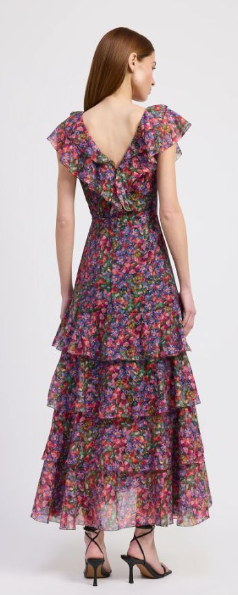 • V-Neck Double Ruffle Neckline Tiered Hi-Lo Maxi Dress