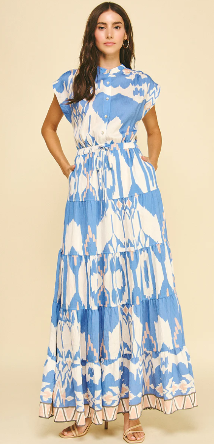 Tie Waist Printed Maxi Dress in Blue