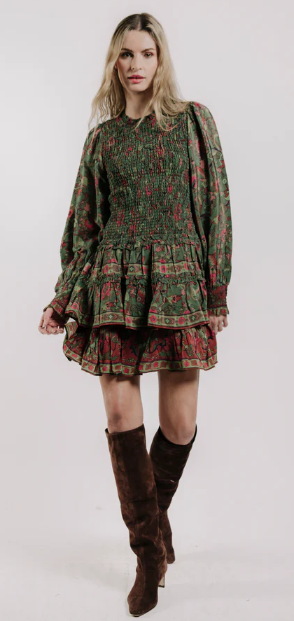 The Yolanda Mini Dress in Helena Print blends romance and ease, featuring a smocked bodice that flatters the figure and a softly tiered skirt that moves with you.