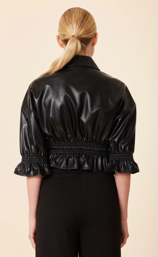 Turn heads this Fall with our faux leather cropped shirt jacket, designed with a structured collar, front button closure, and cinched ruffle hem for a flattering silhouette. The gathered 3/4 sleeves add a touch of feminine edge, making it the perfect statement piece for women’s Fall fashion. Pair with high-waisted trousers or skirts for an effortlessly chic seasonal look.